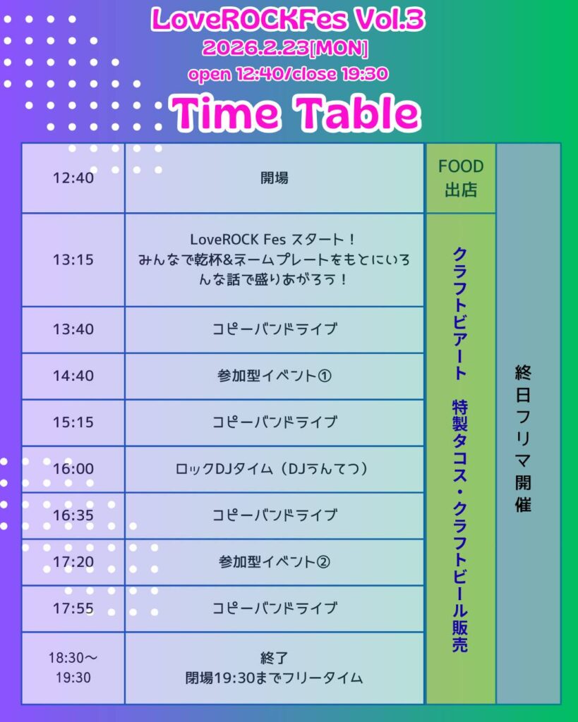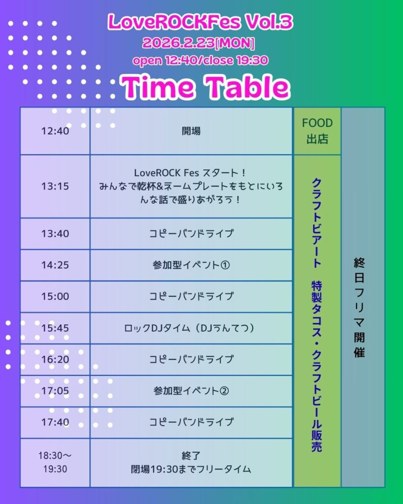 LoveROCKで出会ったメンバーでコピーバンドライブを行います。楽器未経験や初心者の方が1年間練習した成果を披露しますので、是非見に来てほしいです。また、ライブの間や会場内でクイズ企画やフリマブースなど、退屈な時間や1人の時間が出来ないような企画やブースを計画中です。1人で来ても、その場はもちろん、帰り道や明日からのライブも一緒に楽しむことができる最高の邦ロック好き仲間に出会えるフェスにしたいと思います!